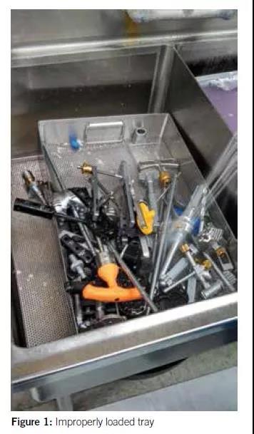 (4)避免在網格托盤中使器械過于擁擠(溶液流通需要足夠的空間)。圖1顯示了托盤中器械過于擁擠,無法允許適當的溶液清洗。
